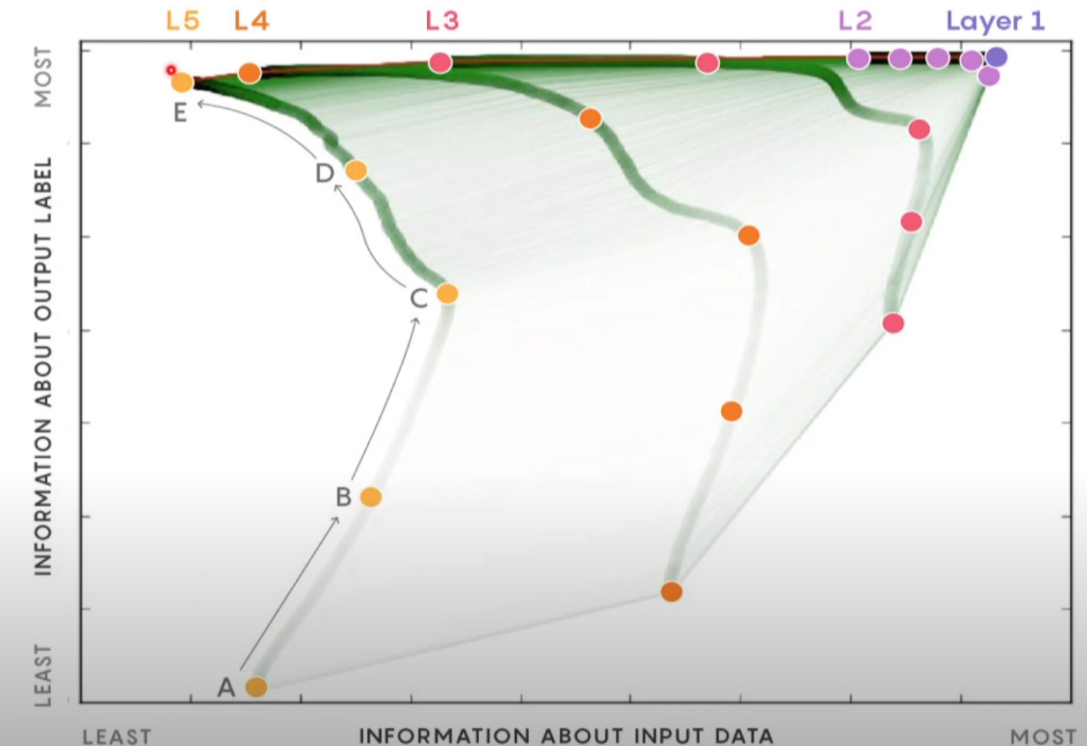 From the animation it is evident the behavior of each hidden layer: as the epochs progress it will move rapidly up to gain information about the output and then move to the left forgetting information about the input. The later compression factor is dependent on the layer where layers closer to the input forget less of the input and deeper layers forget more.