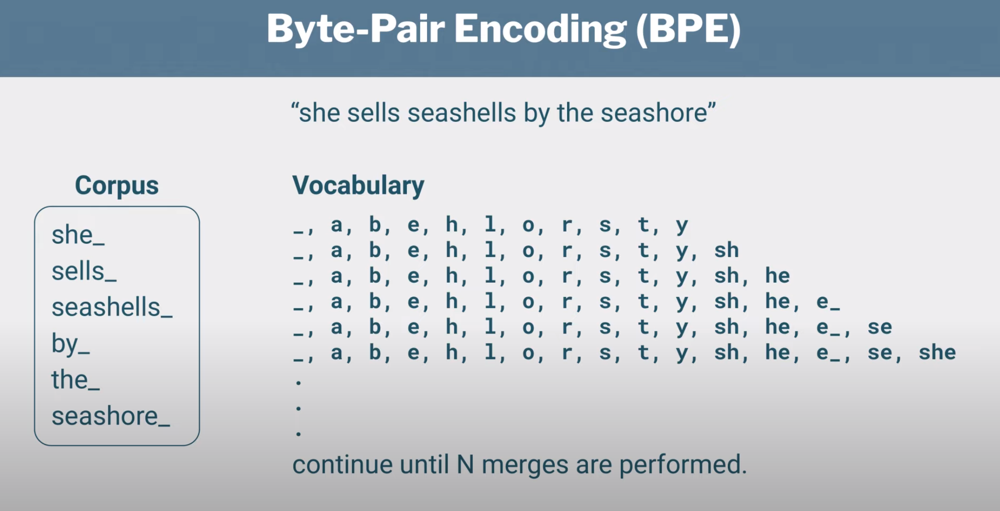 In BPE, one token can correspond to a character, an entire word or more, or anything in between and on average a token corresponds to 0.7 words. The idea behind BPE is to tokenize at word level frequently occuring words and at subword level the rarer words. GPT-3 uses a variant of BPE.