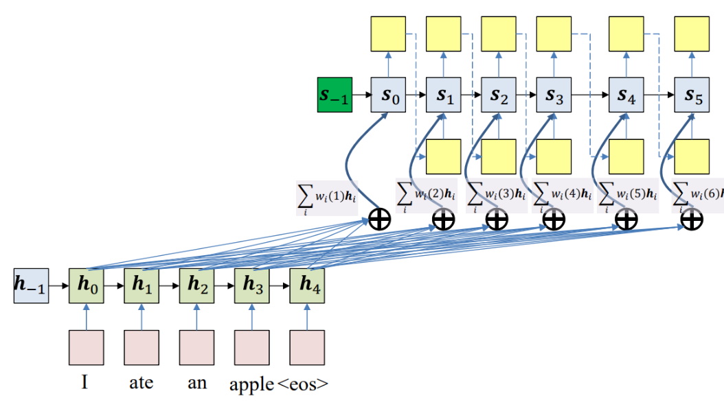 For each hidden state from the source sentence \(h_i\), \(i\) is the sequence index of the encoder hidden state, we compute a score