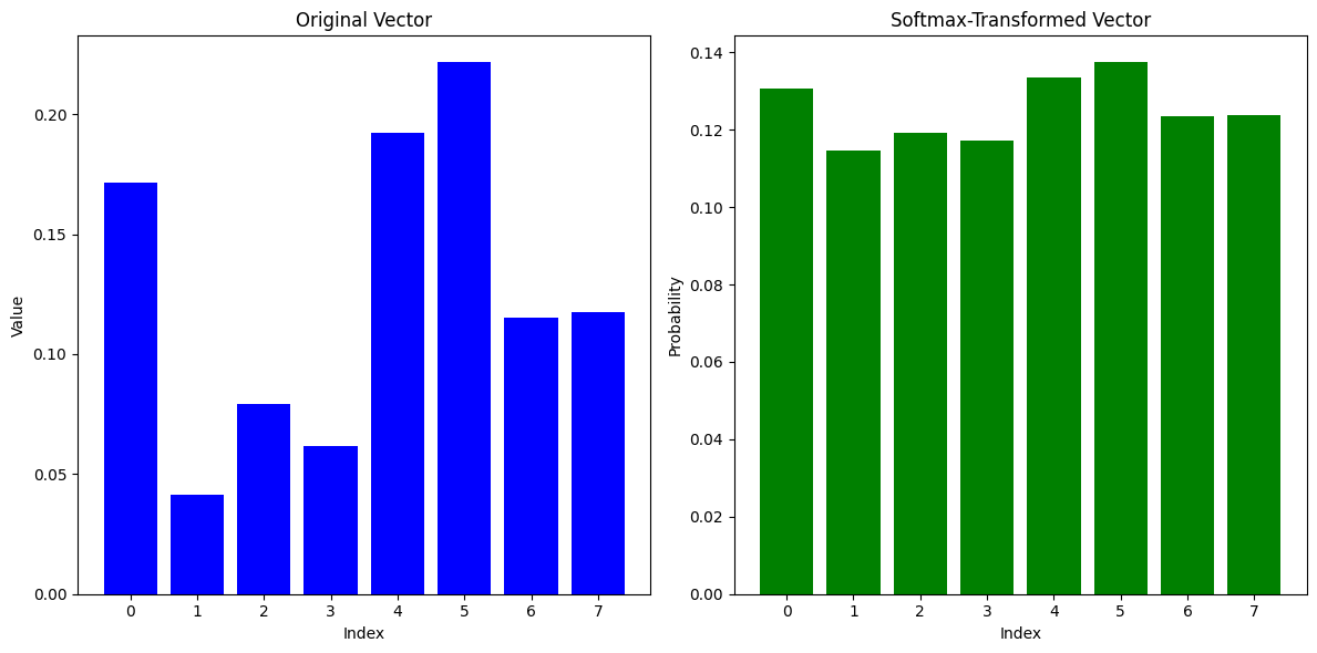 We then divide the result by the square root of the dimension of the key vector (\(d_k\)). This is done in to prevent the softmax from saturating on the higher attention score elements and severely attenuating the attention weights that correspond to the lower attention scores.