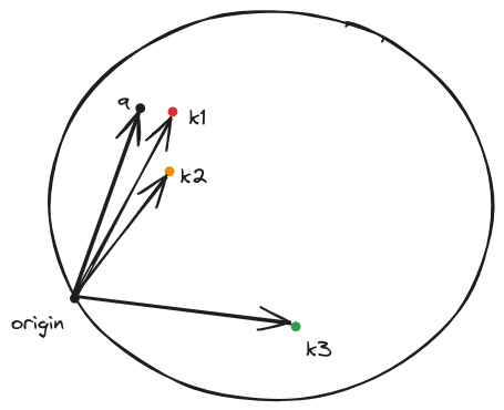 The direct consequence of this positioning in the \(W\) vector space is that the dot product between the query and the nearby keys will be much larger than other far away keys.