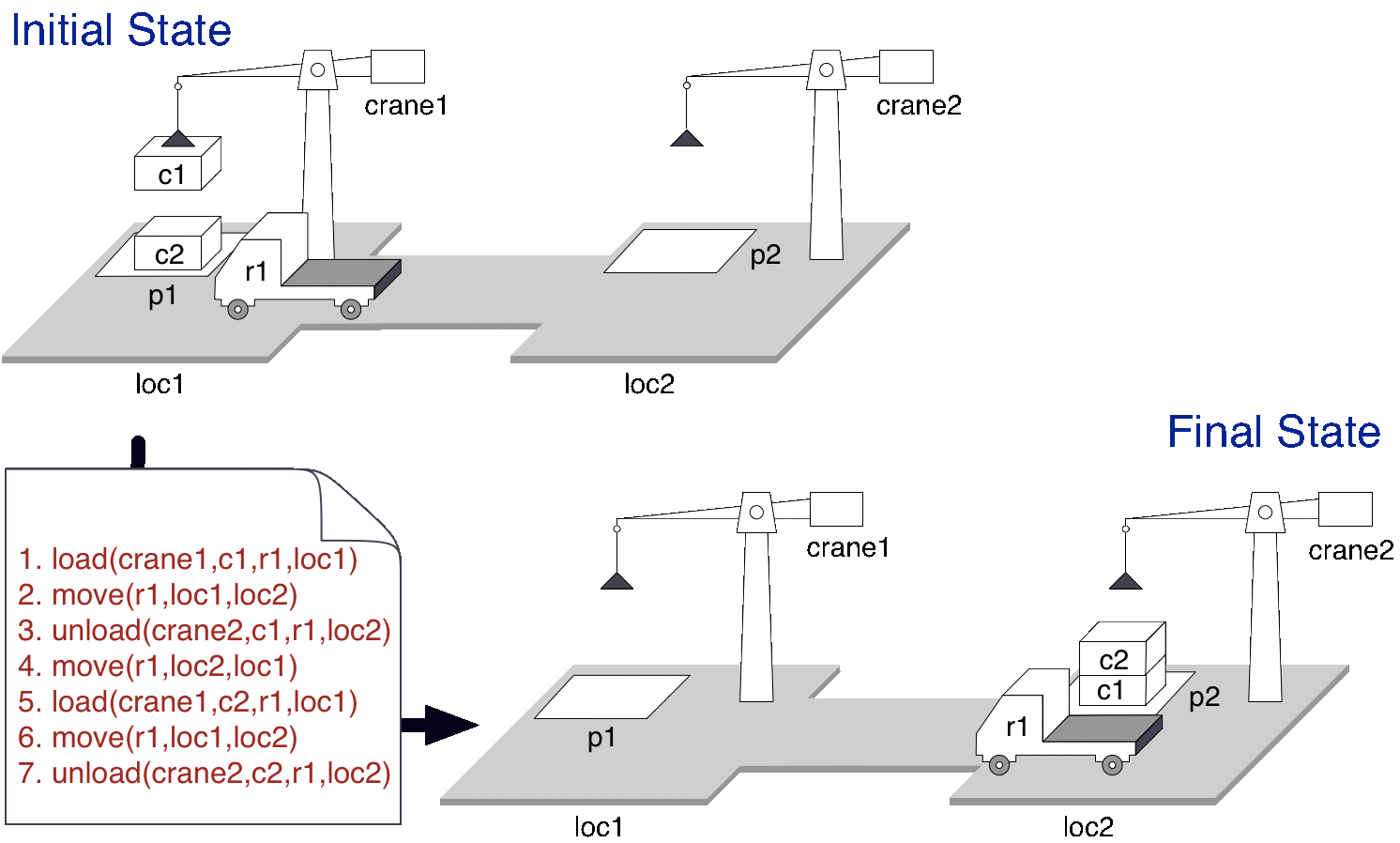The goal is to stack container c2 on container c1 at location p2. Automated planning allows to compute a sequence of actions (plan) that will allow the autonomous robots r1, crane1, crane2 to achieve this task from the initial state (c1 is on c2 at p1). If the initial state were different (due to an unexpected event), the system would still be able to compute another plan to fulfill the task (from PDDL4j).