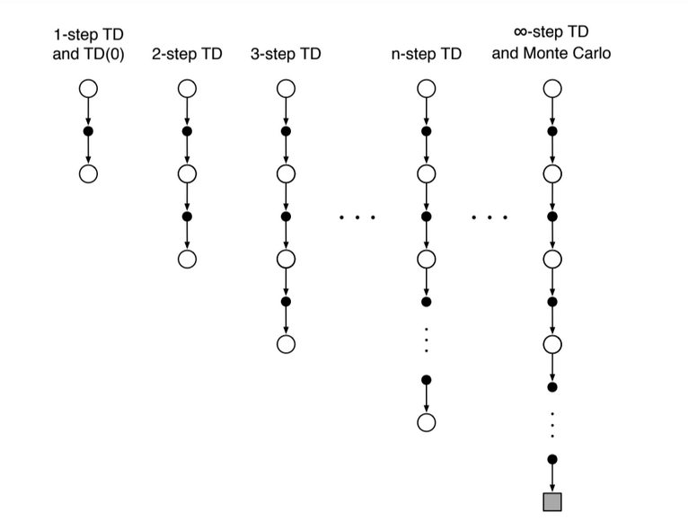 The TD approach of the previous section, can be extended to multiple steps. Instead of a single look ahead step we can take multiple successive look ahead steps (n), we will call this TD(n) for now, and at the end of the n-th step, we use the value function at that state to backup and get the value function at the state where we started. The trees below are indicative of the process.