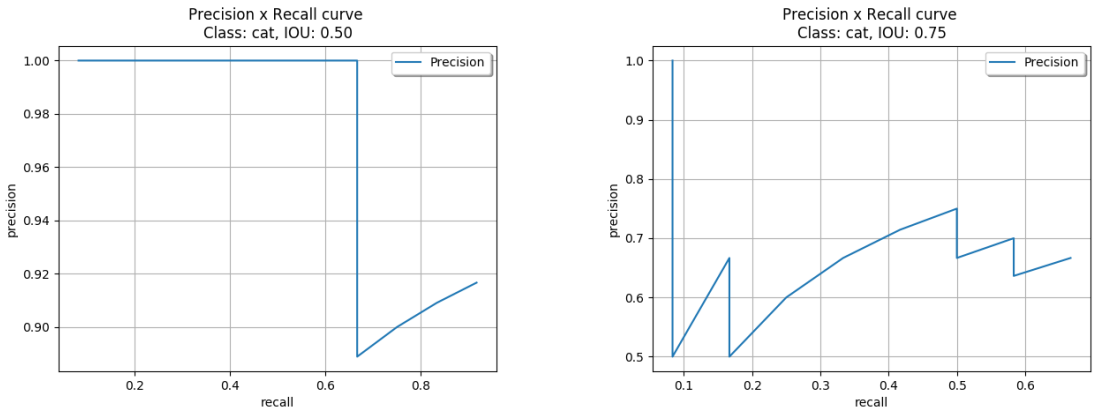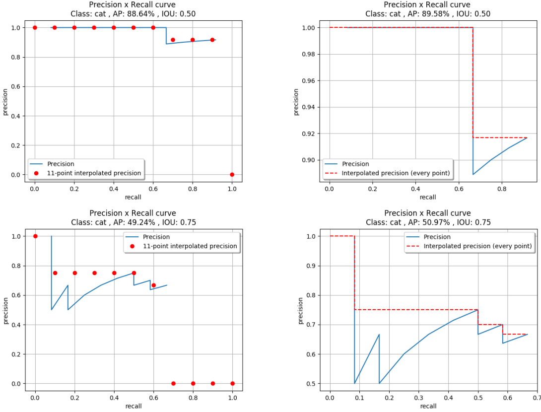 When an IOU threshold t=0.5 was applied (plots of the first row in image above), the 11-point interpolation method obtained AP=88.64% while the all-point interpolation method improved the results a little, reaching AP=89.58%. Similarly, for an IOU threshold of t=0.75% (plots of the second row in image above), the 11-point interpolation method obtained AP=49.24% and the all-point interpolation AP=50.97%.