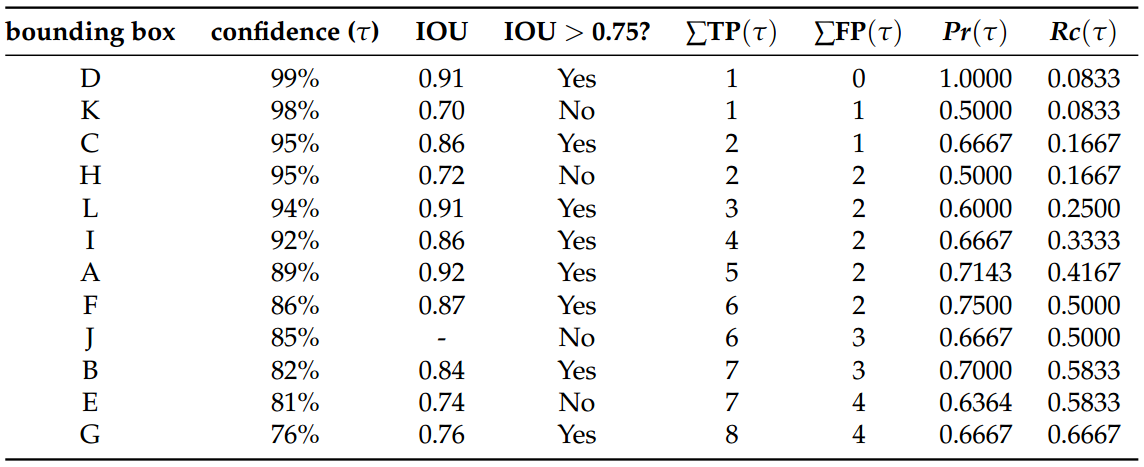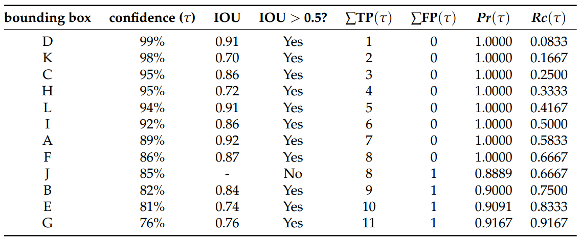 By choosing a more restrictive IOU threshold, different precision x recall values can be obtained. The following table computes the precision and recall values with a more strict IOU threshold of t = 0.75. By that, it is noticeable the occurrence of more FP detections, reducing the recall.