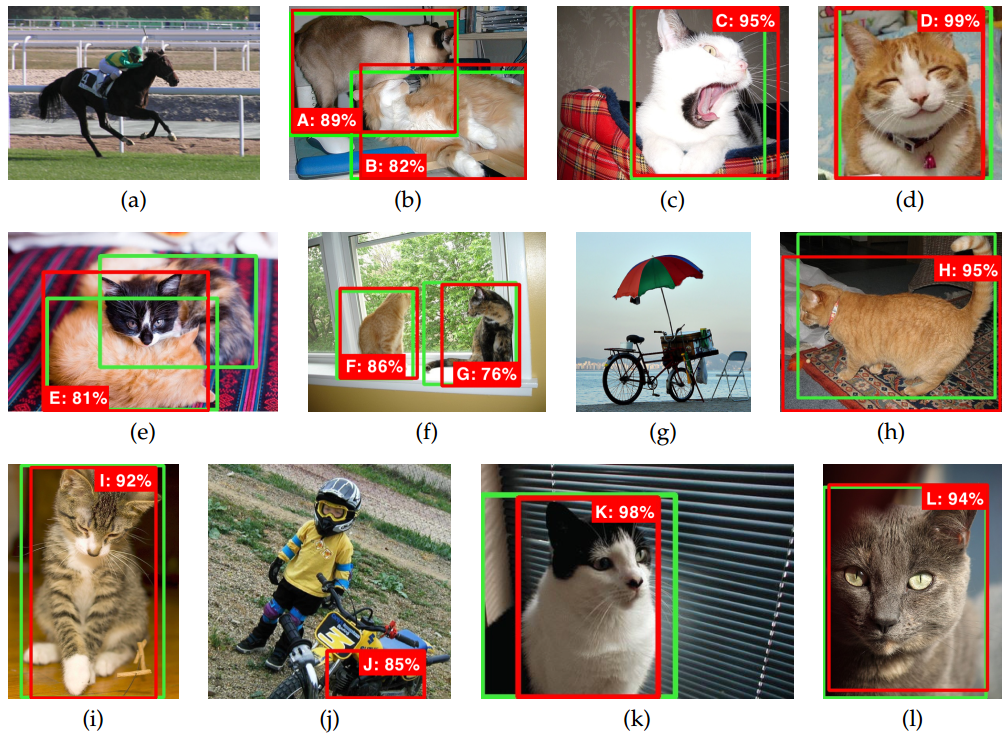Each image, except (a), (g), and (j), has at least one target object of the class cat, whose locations are limited by the green rectangles. There is a total of 12 target objects limited by the green boxes. Images (b), (e), and (f) have two ground-truth samples of the target class. An object detector predicted 12 objects represented by the red rectangles (labeled with letters A to L) and their associated confidence levels are represented in percentages. Images (a), (g), and (j) are expected to have no detection. Conversely, images (b), (e), and (f) have two ground-truth bounding boxes.