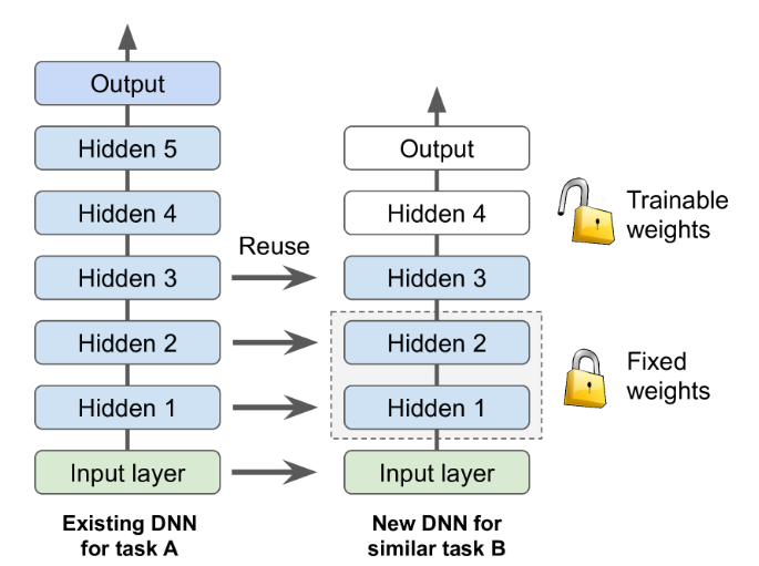 Because these low-level features are captured in the lower layers of the network as shown below, we reuse the base of the network. Similarly, the upper hidden layers of the original model are less likely to be as useful as the lower layers, since the high-level features that are most useful for the new task may differ significantly from the ones that were most useful for the original task. You want to find the right number of layers to reuse.